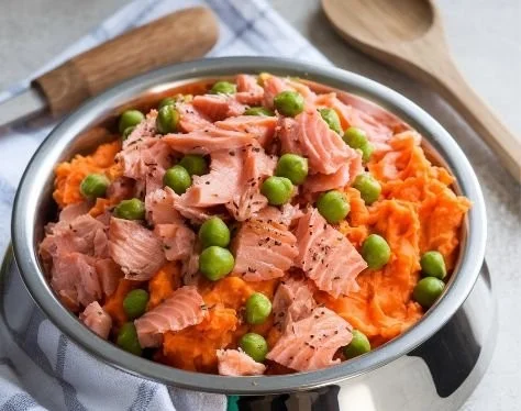 A nutritious homemade dog food featuring salmon and sweet potatoes, perfect for keeping your furry friend happy and healthy.