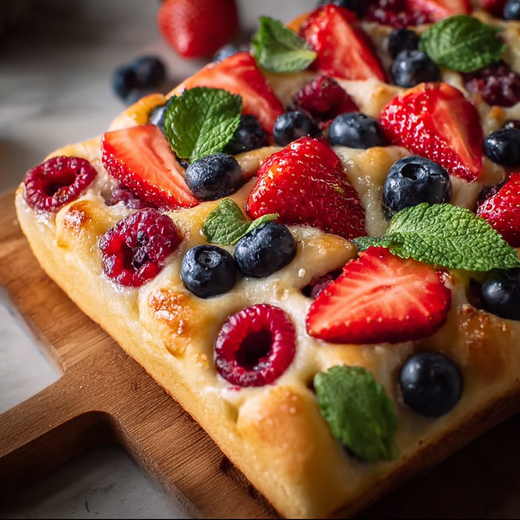 Serving sweet focaccia can be as simple or as elegant as you wish. Enjoy it warm straight from the oven, spread with a pat of butter or a drizzle of honey. Pair it with cheese like creamy goat cheese or a sharp aged cheddar for a lovely contrast. It’s also delicious when served alongside fresh fruits, making it a versatile side dish for any meal. Consider serving it with fresh salads or as a base for a unique sandwich.